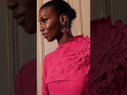 A modern strapless crepe jumpsuit featuring a dramatic overhead long-sleeve cape adorned with 3D floral appliqués. A striking choice for an evening event, combining contemporary elegance with couture-inspired detail.