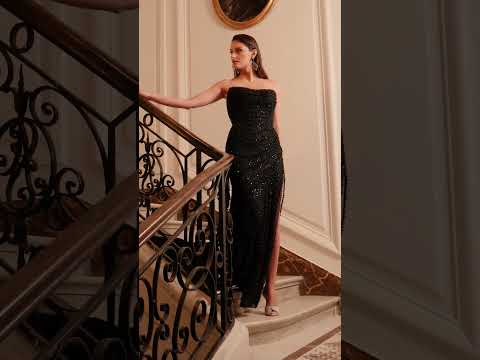 Make a statement in this exquisite full-length beaded fit-and-flare dress. Showcasing a strapless sweetheart neckline, a sculpted pleated bodice, and a striking high-thigh split, it’s designed for unforgettable evening elegance.