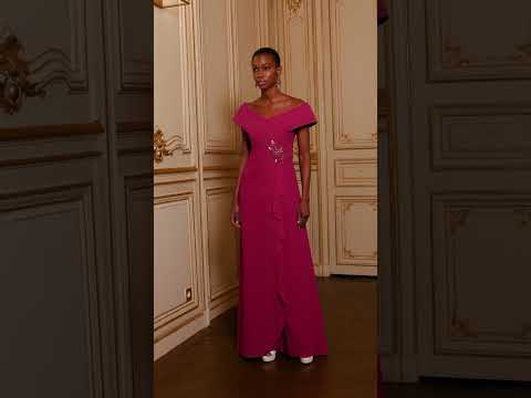 Featuring a flattering off-the-shoulder neckline and delicate pleating across the bodice, this dress exudes timeless elegance. A cascading ruffle detail and intricate floral embellishment at the waist add a touch of glamour, while the soft chiffon fabric creates graceful movement.