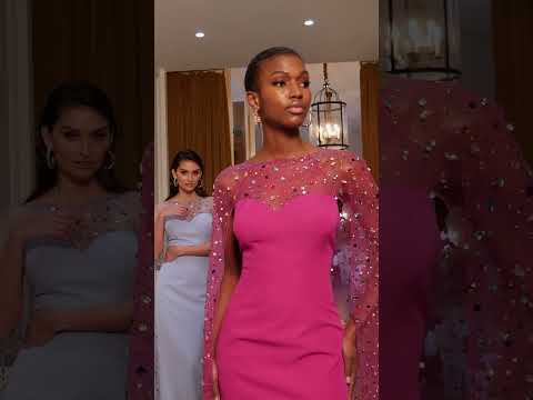 Exuding refined elegance, this midi-length fitted crepe dress showcases a delicate illusion neckline and a flowing beaded tulle cape. A captivating choice for evening events or special occasions.