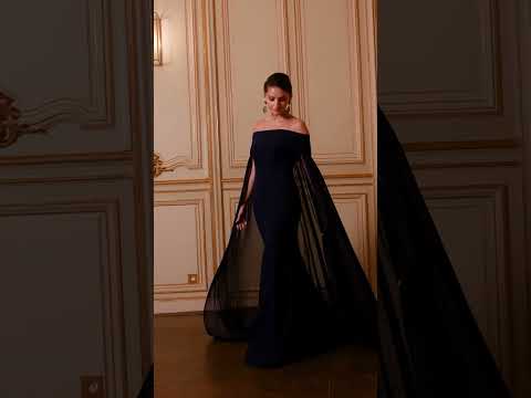 A sophisticated and timeless full-length fit-and-flare gown designed to exude effortless elegance. Featuring an off-the-shoulder neckline and dramatic sweeping cape-style sleeves, this dress creates a graceful silhouette perfect for any formal occasion or special event.