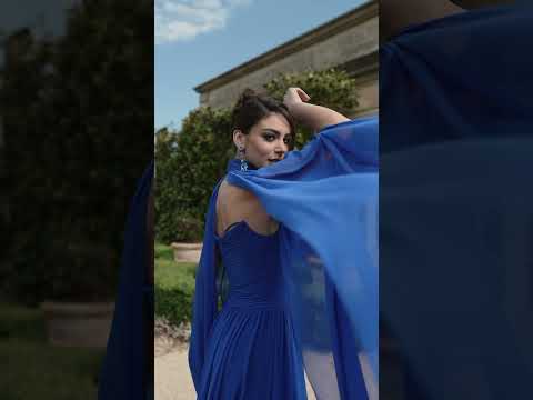 Effortlessly beautiful, this chiffon A-line gown exudes modern romance. The strapless silhouette is elevated with a detachable cape and detachable sleeves, allowing versatile styling for any occasion. A chic high-neck choker detail adds a contemporary edge, creating a look that is both timeless and unforgettable.