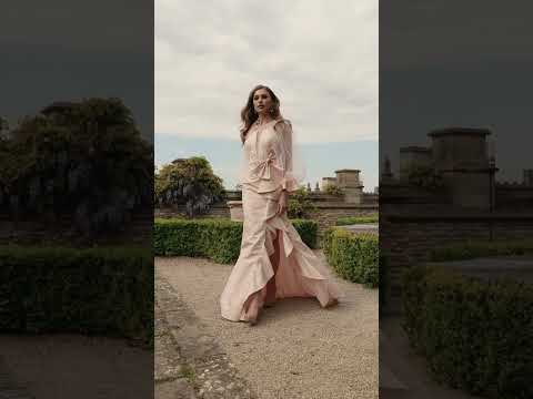 Chic and fashion-forward, this elegant fit-and-flare gown features an illusion high neckline and sheer long trumpet sleeves for a touch of modern sophistication. Finished with a statement side bow motif and a pleated ruffle slit, this dress perfectly balances contemporary style with timeless femininity.
