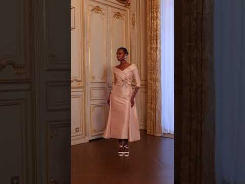 A chic fit-and-flare crepe dress, perfect for the mother of the bride or groom. Featuring a pleated V-neckline, 3/4 fitted sleeves, and a delicate 3D floral motif at the waist, this gown combines timeless elegance with modern refinement, embodying the signature sophistication