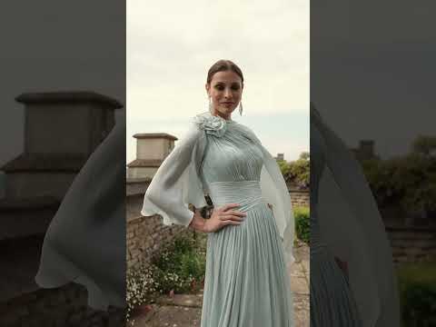 Designed with delicate pleating that enhances the waist and bodice, the gown flows gracefully into a soft, floor-length skirt. A sheer chiffon cape drapes elegantly over the shoulders, finished with a statement floral applique for a touch of romantic drama.