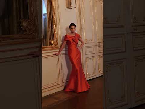 A vision of sophistication, this elegant mermaid silhouette features an off-the-shoulder neckline with delicate cap sleeves. The look is beautifully finished with an eye-catching oversized bow detail, adding a touch of drama and feminine charm to this timeless design.