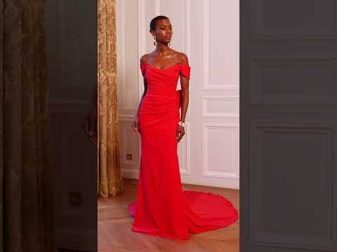 Perfect for the chic minimalist, this fitted crepe wedding dress exudes effortless sophistication. An off-the-shoulder pleated bodice beautifully frames the neckline, while a modern, free-flowing train adds graceful movement and understated drama, creating a look that is timelessly refined.