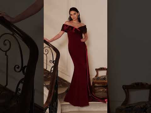 Turn heads in this stunning fitted gown, featuring an off-the-shoulder V-neckline and structured cap sleeves for a refined silhouette. Draped organza detailing adds fluid movement and a touch of ethereal elegance, making this gown perfect for a show-stopping entrance.