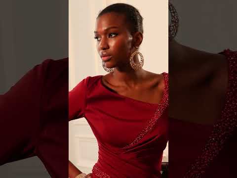 Exude sophistication in this regal fit-and-flare gown, featuring a modern asymmetrical neckline and 3/4 fitted sleeves for a contemporary touch. The pleated bodice is enhanced with delicate beadwork, creating a refined, elegant silhouette perfect for formal occasions.