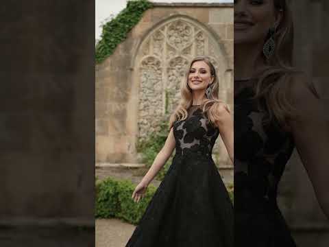 A striking lace ballgown adorned with shimmering beaded botanical florals. The illusion high neckline and fitted, beaded bodice sculpt a beautifully defined waist, flowing into a sweeping full skirt. Refined, graceful, and effortlessly glamorous