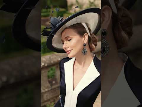 Woman in a navy blue dress with a white shirt and large hat standing in a garden.