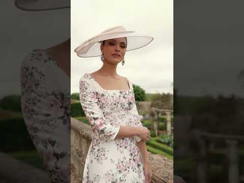 Woman in a floral dress and hat standing under a wooden arbor with greenery.