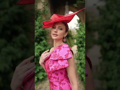 Woman in a pink floral dress and hat standing in an outdoor garden setting.