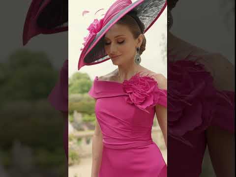 Woman in a pink dress with a floral hat standing in a garden setting.