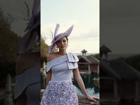 Woman in a lavender outfit with a matching hat standing in front of a stone wall with greenery.