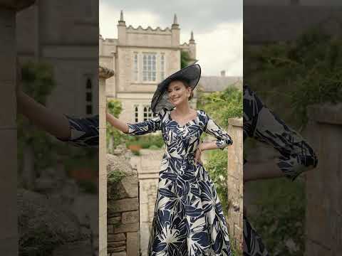 Timeless and elegant, this A-line Mikado midi dress features a wide V-neckline, three-quarter fitted sleeves, and a cinched waist. Draped pleated detailing and delicate 3D floral motifs complete the silhouette, creating a refined, couture-inspired look that exudes sophistication.