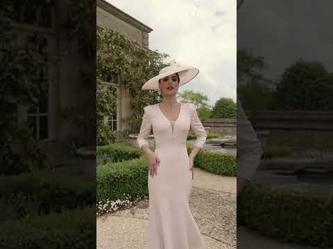 A classic fit-and-flare crepe dress featuring a fitted bodice, three-quarter sleeves, and a flattering deep V-neckline. The contrasting plain skirt is complemented by 3D beaded floral appliqués on the shoulders, creating a refined and sophisticated silhouette.