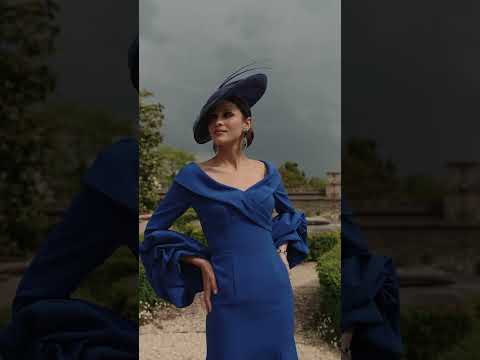 “A modern mid-length fit-and-flare crepe dress featuring a wide V-neckline and dramatic 3/4 puff sleeves. The structured silhouette balances contemporary statement detailing with timeless elegance.