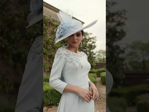 Woman in a light blue dress and hat posing against a stone wall with greenery.