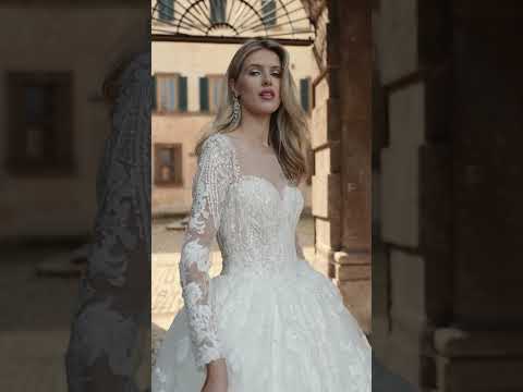 This magnificent ballgown wedding dress embodies pure enchantment. The fitted bodice features a sweetheart neckline layered beneath a sheer overlay, creating an elegant illusion V-neck and delicate long sleeves, all intricately embellished with shimmering beadwork and gorgeous lace appliques.